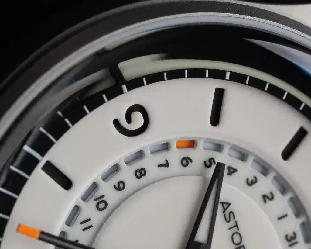 Rather than isolating the date in a window, the Terra Scout integrates it into the dial layout. The date track sits recessed between the central sector and the hour track, with a white date wheel underneath and a rotating orange dash acting as the indicator. It reads as part of the dial system rather than an interruption, which feels very much in line with the brand’s recent design approach.