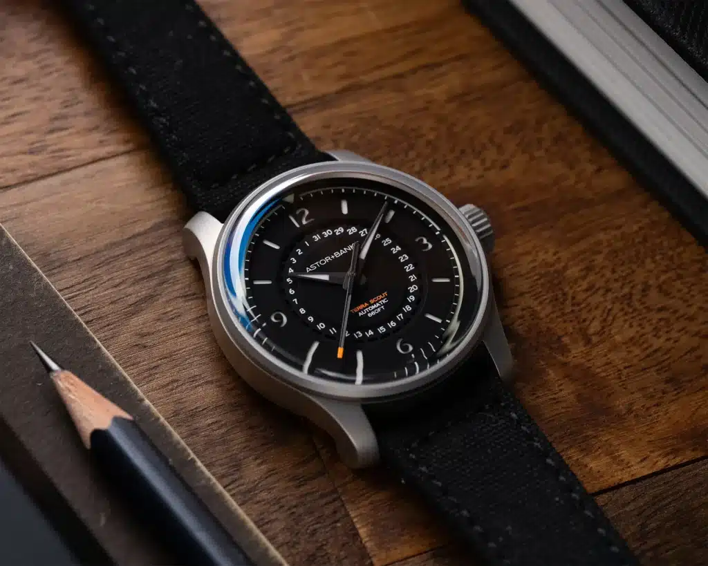 Field watches tend to operate within a fairly defined visual framework, which makes meaningful deviation difficult without sacrificing legibility or purpose. The Terra Scout works within that constraint by reworking familiar elements instead of defaulting to expected ones. There are no syringe hands or printed military time scales. Instead, Astor and Banks uses blunted dauphine hands with partially lumed inlays, paired with a rotating date indicator that takes the place of the inner 24-hour track commonly associated with the genre.