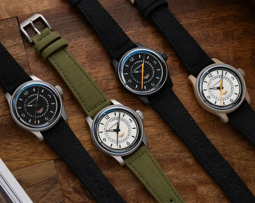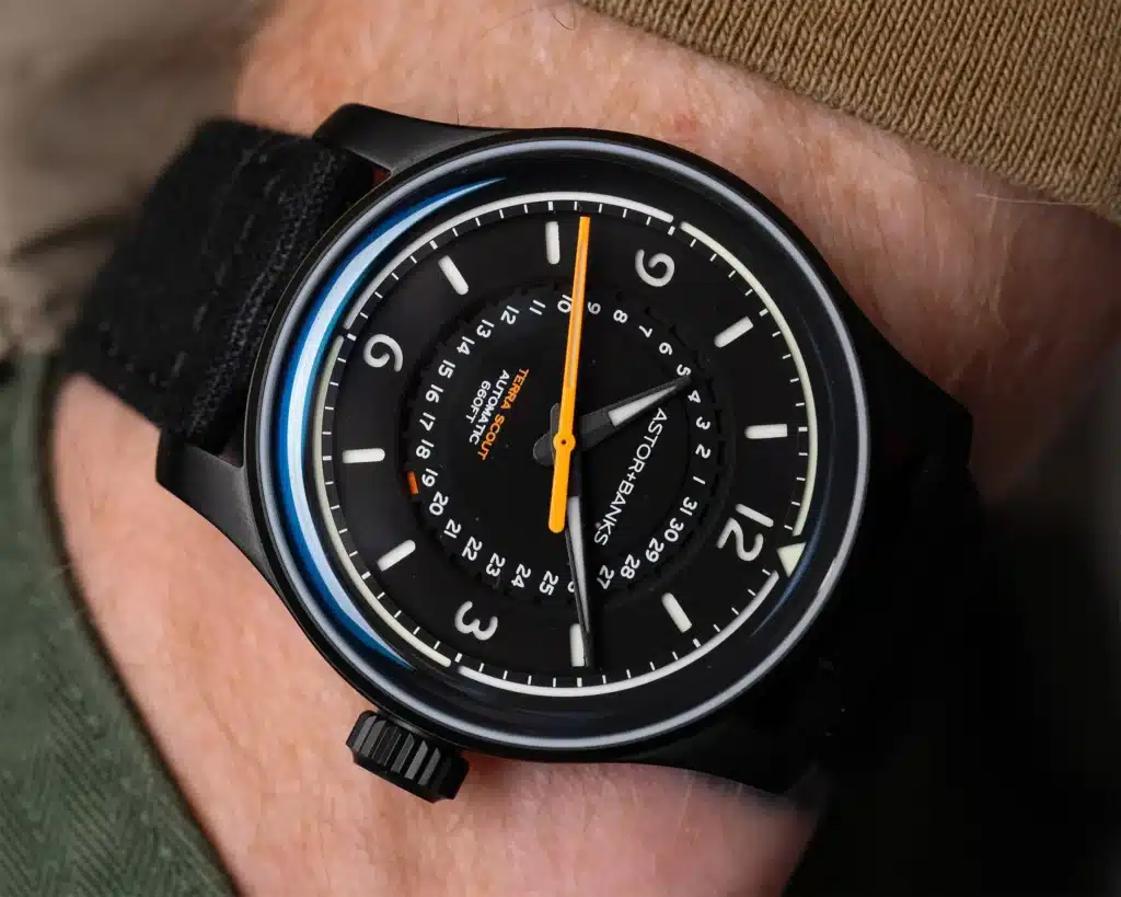 Lume plays a central role in the Terra Scout’s identity. Astor and Banks uses Super-LumiNova to create an alternating blue and green luminous ring around the outer edge of the dial, topped by a green triangle at 12 o’clock. On black dials, the hour track glows blue. On white dials, the entire dial surface is lumed, allowing the raised hour track to stand out while keeping the date track visible in low light. All hands glow blue, including the fully orange seconds hands.