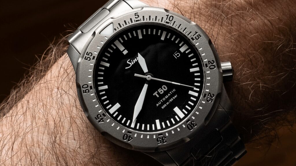 The Sinn T50 makes a strong case for toolish restraint done right. Spending time with it feels like Sinn took the core ideas behind the U50, stripped away anything unnecessary, and rebuilt the watch around comfort and durability. The matte titanium case is central to that experience. It keeps reflections to a minimum and never tries to dress itself up, which makes it easy to forget you’re wearing it once it’s on. At around 95 grams on a 7-inch wrist, it stays light and well balanced, sliding under sleeves without fuss, whether you’re working with your hands, riding, or just moving through a typical day. The crown at 4 o’clock was easy to operate during testing and stayed clear of wrist movement.