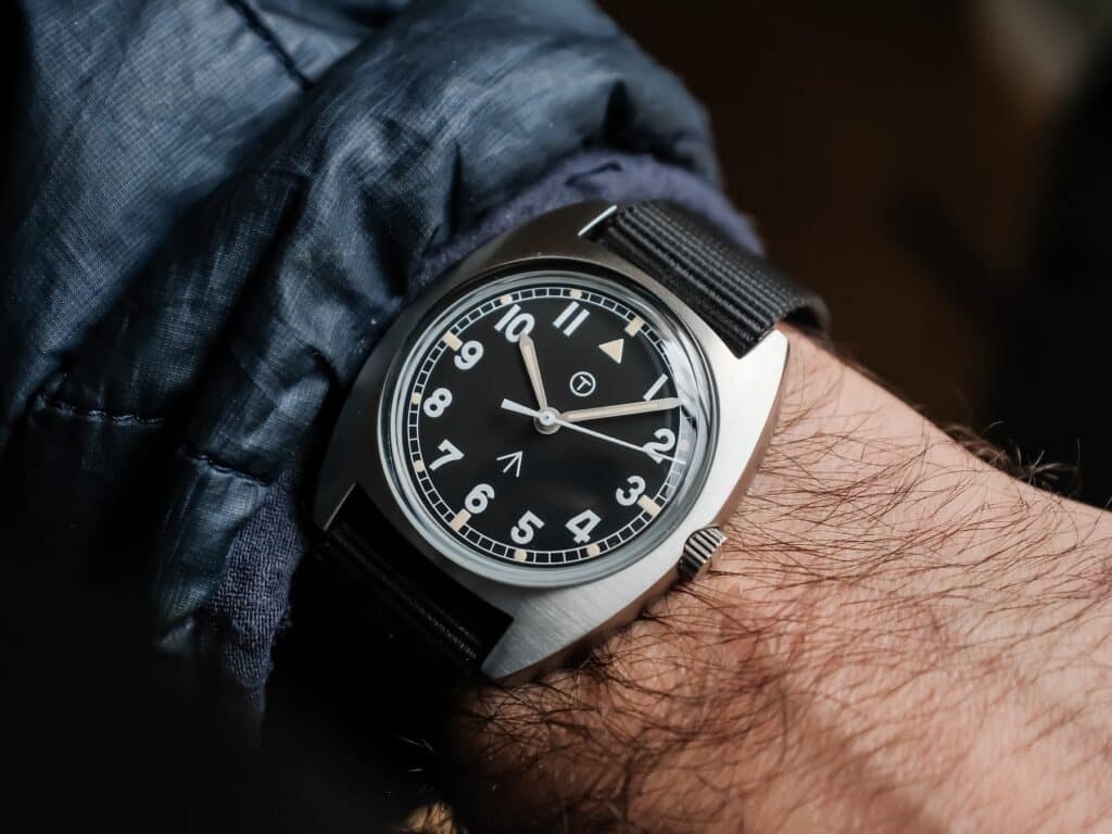 The dial is where Rdunae’s priorities show. Matte black with crisp white Arabic numerals, it is built around clarity. The fully lumed triangle at twelve and the small “T” marking serve as historical references without overselling authenticity. The broad arrow at six and the clean railroad minute track complete the layout, giving the dial a sense of purpose without visual noise. Pencil-style hands are proportioned well and stay legible without crowding the numerals. What stood out most to us was what was left off. There is no branding, no water resistance text, and no filler. The result feels deliberate rather than bare, and in daily use, the dial stayed easy to read at a glance.