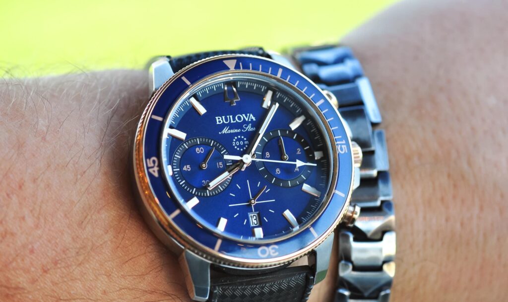 Bulova, founded in 1875, has never chased prestige, and that’s part of its charm. The brand leans into accessibility and personality, often taking bold design decisions that most mainstream watchmakers wouldn’t. During our time testing the Bulova Marine Star Chronograph 98B301, its bold 45 mm steel case, bi-color bezel, and deep blue dial stood out, and the pushers clicked with reassuring firmness. Their approach is about confidence and character, even if that sometimes means trading polish for personality. It’s a brand that celebrates individuality, and for many collectors, that’s precisely the point.