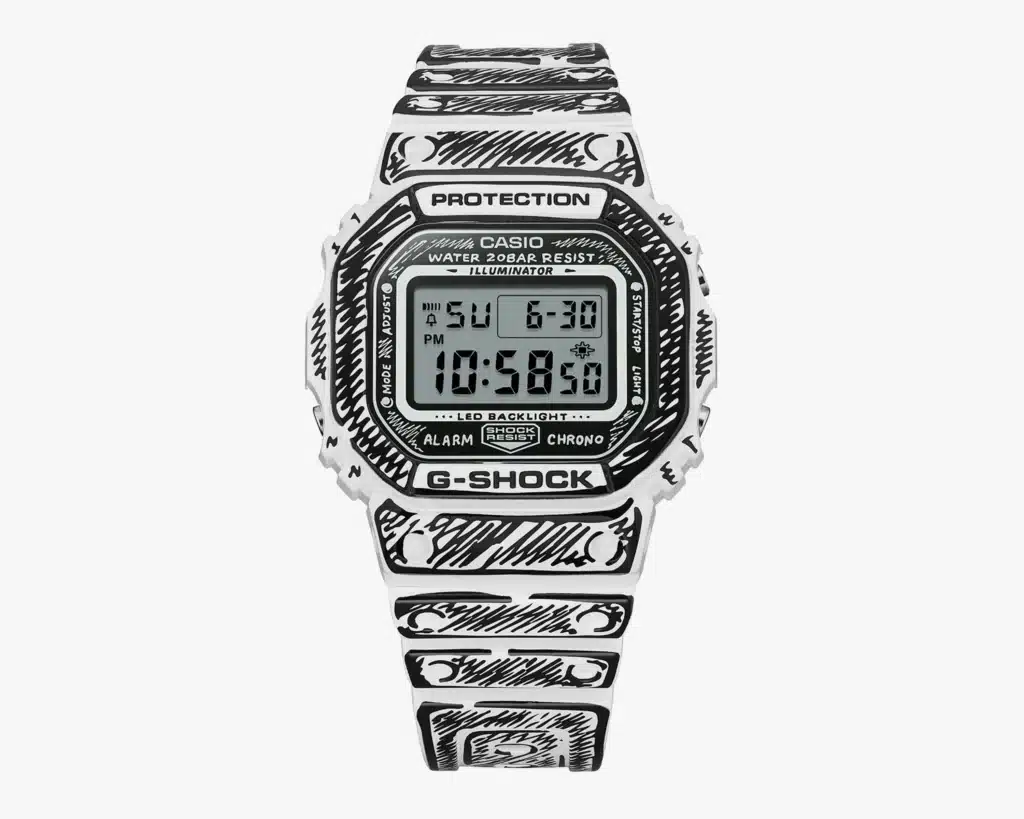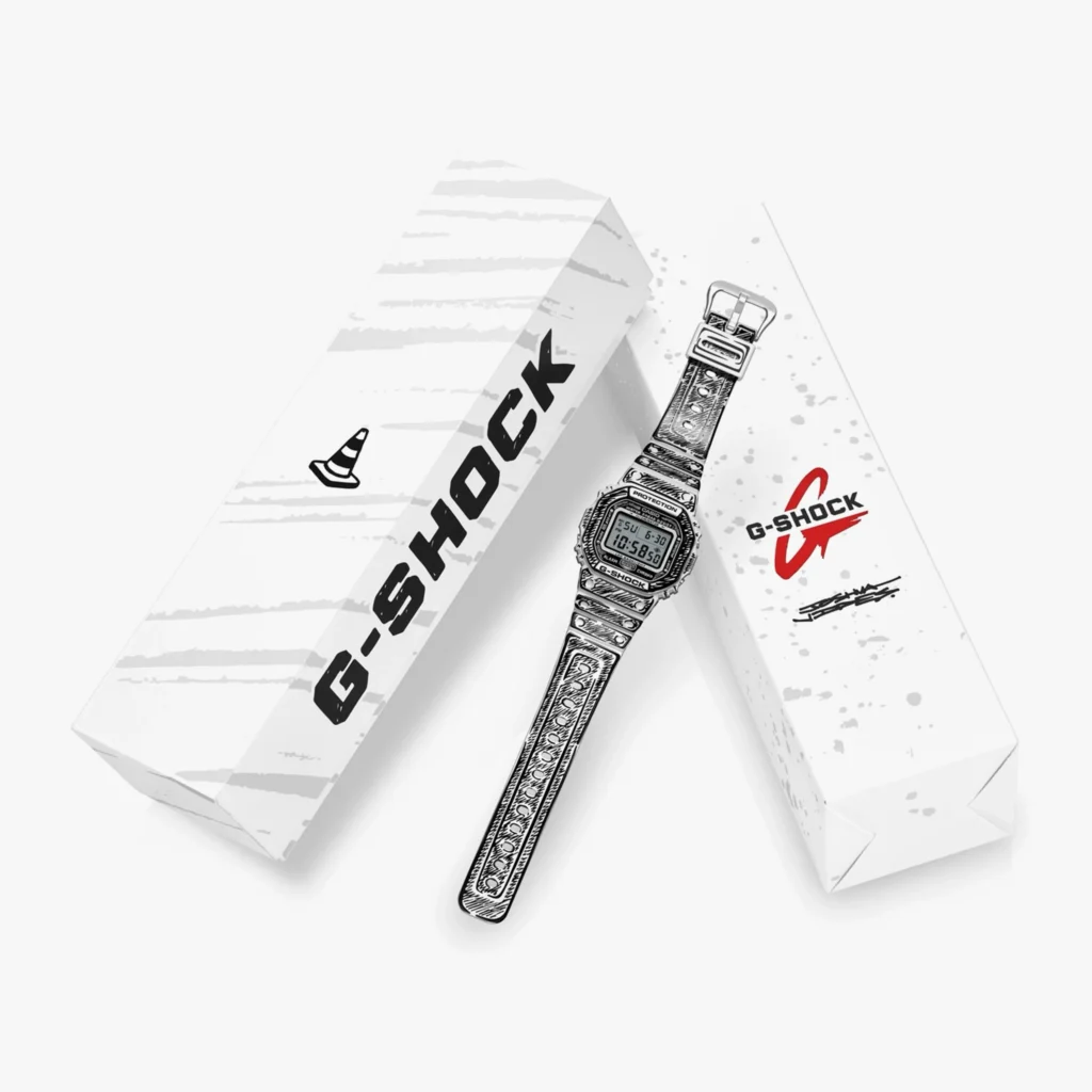 The case back carries a custom engraving with the artist’s signature. Both models retain the full standard G-Shock spec underneath all of it: shock-resistant construction, 200-meter water resistance, a 1/100-second stopwatch, countdown timer, and multi-function alarm. At $180, they’re priced the same as a lot of standard production Casio G-Shock releases, which is worth noting for a limited collaboration that could have easily gone higher. My guess is the white DW5600JV-7 will be the more divisive of the two. The sketched lines are bold and there’s a lot going on.