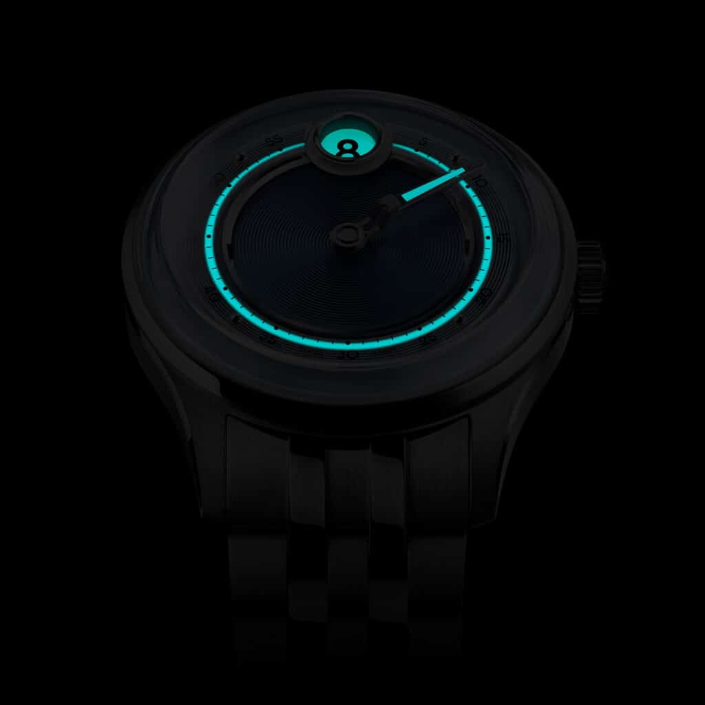 The design language stays consistent with Christopher Ward’s recent catalog. The 39 mm stainless steel case blends brushed planes and polished chamfers, measuring 14mm thick with a box‑style sapphire crystal and 47.3 mm lug‑to‑lug. The dial construction layers a stamped center, metallic framing, a sapphire minute track, and a stepped sapphire minute hand. The jump hour window is enhanced by a ceramic Globolight insert for improved contrast and visibility.