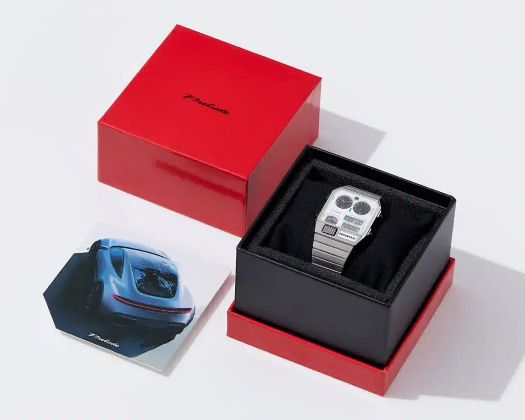 Branding is handled with relative restraint. Not like those dang Star Wars versions. The Honda “H” logo sits at 12 o’clock, and the wordmark appears on the lower right side of the dial. The solid caseback features the resurrected Prelude logo. It comes packaged in a red box with Prelude branding and an image of the new hybrid coupe, which feels more like a collector’s nod than a heavy-handed marketing push.