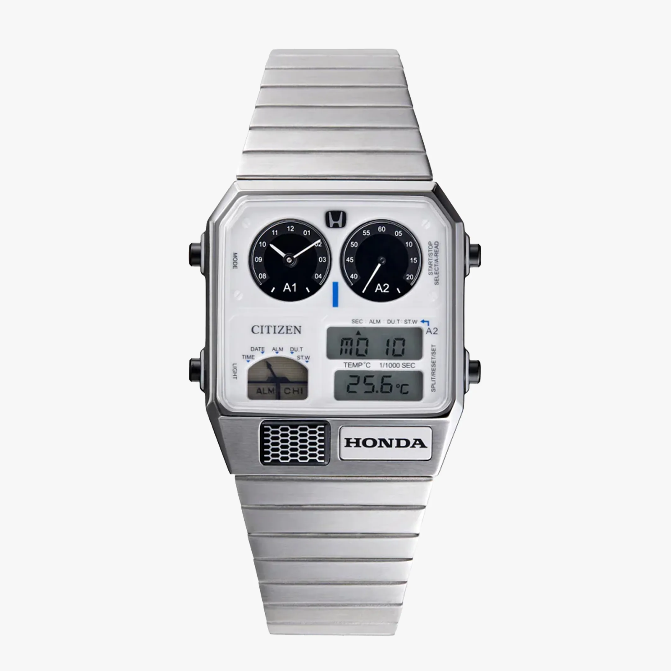 This new Citizen x Honda Ana-Digi Temp “2026 New Prelude” Limited Edition is built on the same platform Citizen has been using since it reintroduced the Ana-Digi Temp in 2020. That means we’re still looking at the compact 32.5mm wide, 40.6mm long rectangular stainless steel case, only 8mm thick, paired to a single-row tapering bracelet. It runs on the Citizen Caliber 8989 quartz movement and offers 50 meters of water resistance. Mechanically, this isn’t a reinvention. It’s a cosmetic and thematic remix.