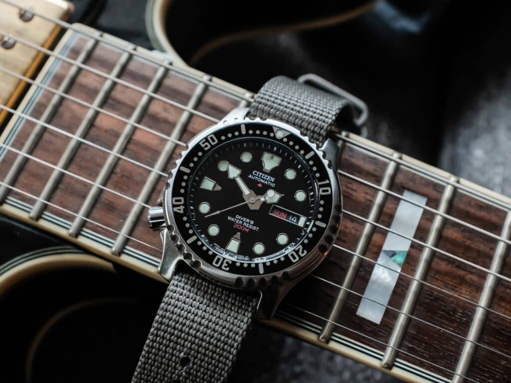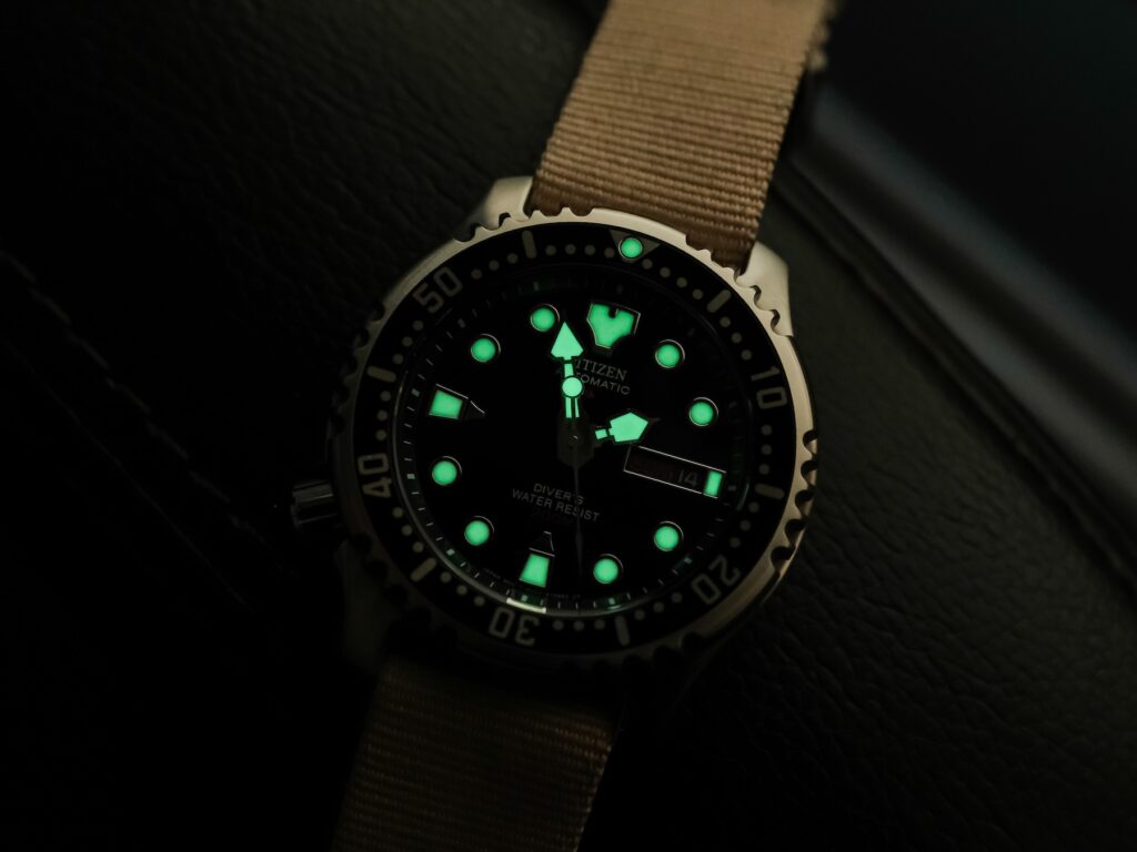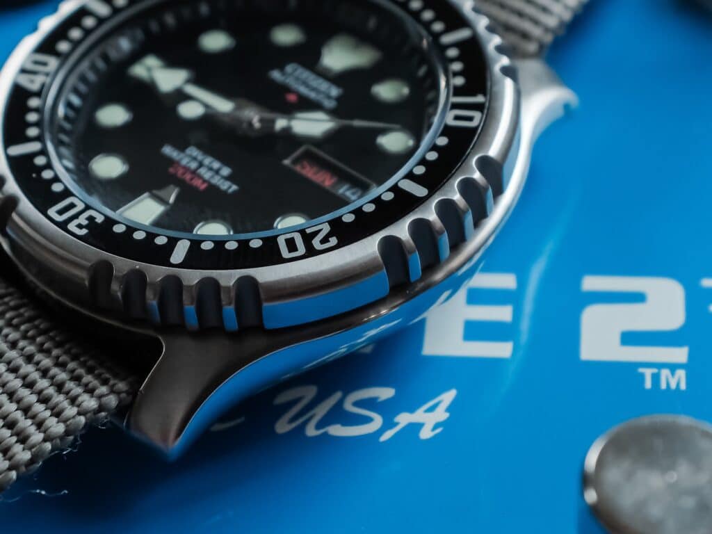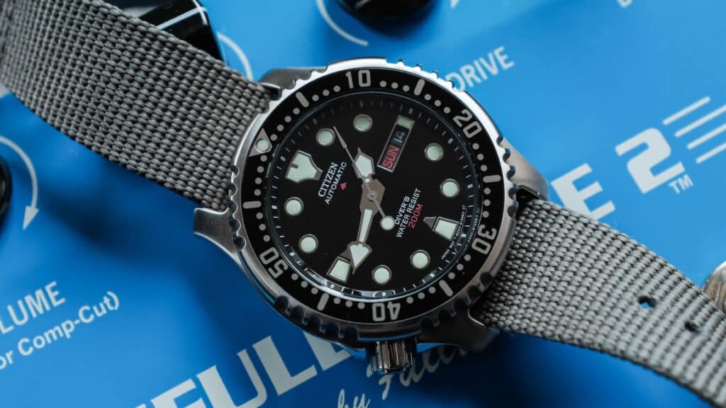 Up top, the branding is refreshingly straightforward. “Citizen Automatic” sits beneath twelve o’clock, stating exactly what the watch is without any embellishment. Just below that, the small red arrow adds a touch of character. It’s a detail long associated with Citizen dive watches, and it brings a bit of visual punctuation without disrupting the balance of the dial.