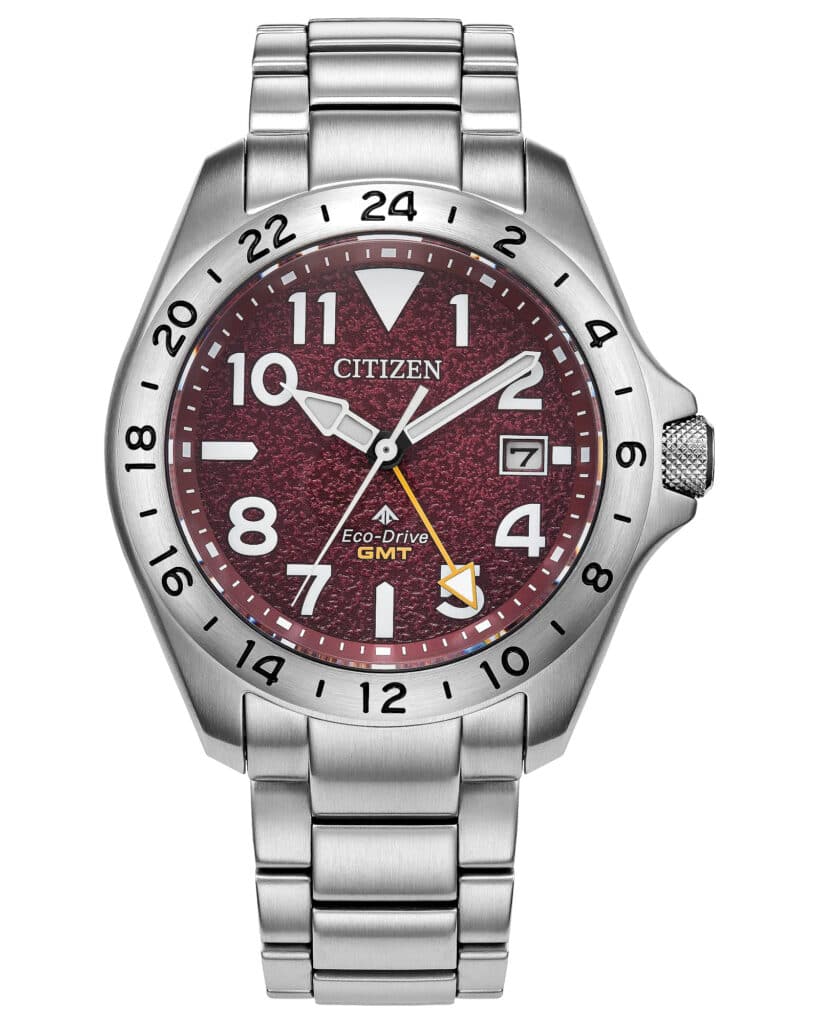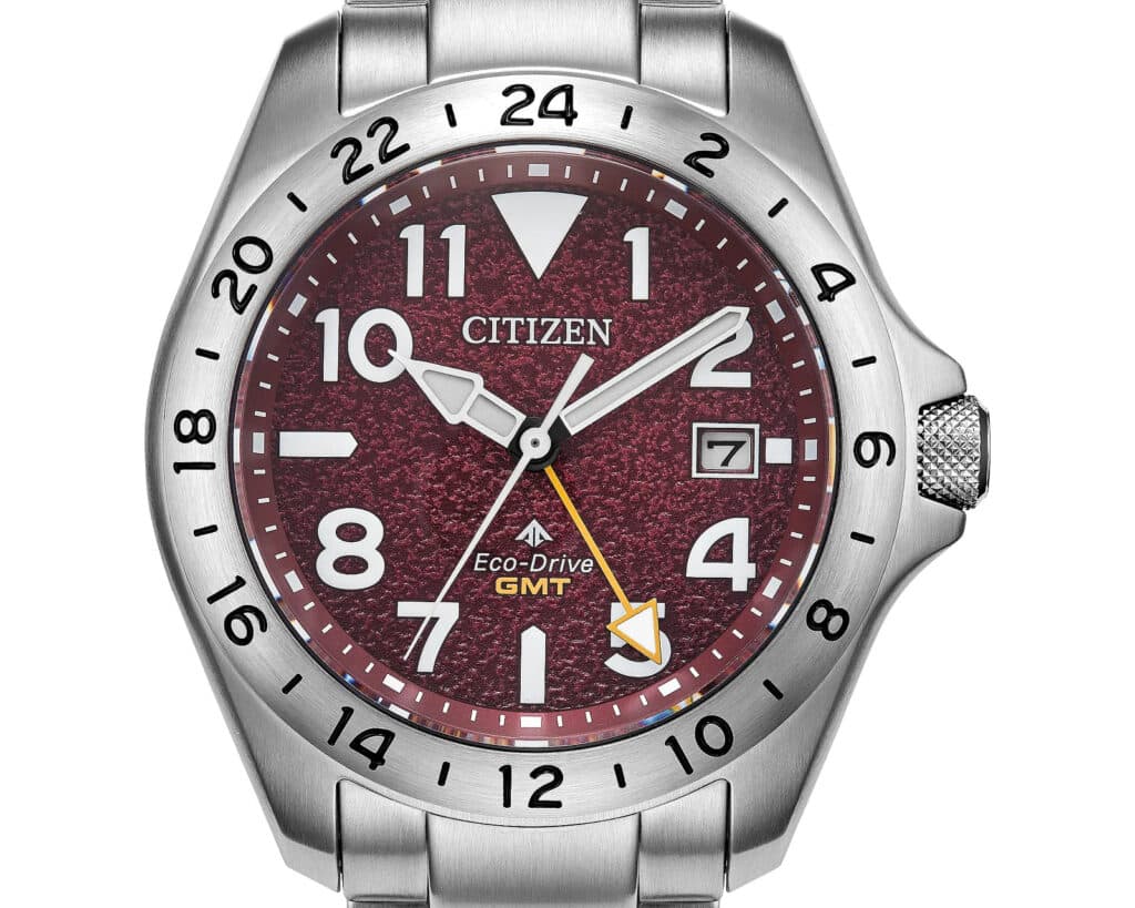 The dial is where the watch gets its personality. A textured red surface provides depth, while crisp white markers keep legibility front and center. Those markers are a big selling point for me and I’ve loved them ever since seeing them on earlier Promaster Tough models. An orange GMT hand adds contrast without overwhelming the layout, and a fixed 24-hour bezel reinforces the travel-focused design. A date window at three o’clock adds daily practicality while staying visually restrained. Now, this dial color isn’t for me, but my hope is that Citizen expands upon the platform with new color options. Throw in a full titanium version for good measure—and I’ll lose my mind.