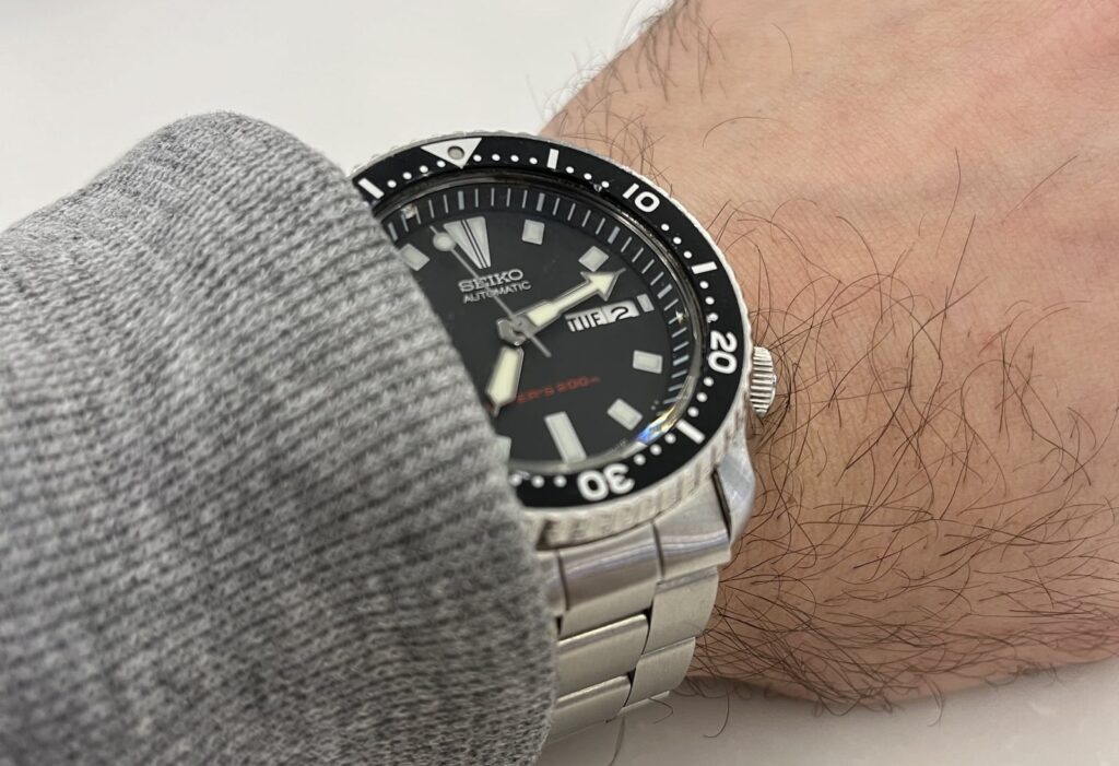 While testing the SKX173, our review team found that the 4 o’clock screw-down crown kept it comfortable and secure, helping maintain the ISO-rated 200m water resistance. This means that it is truly suitable for diving purposes and should be viewed as a tool first, and anything else second.