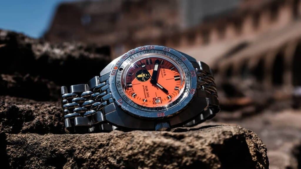 Part of the story goes that the logo itself caused trouble early on. That solid circle sat so close to the fat black minute hand that it apparently became an issue when glancing at the dial underwater. Whether that’s apocryphal or not, Doxa moved on from the filled version pretty quickly and shifted to the familiar outline style we all know from the later SUB 300T generations. This reissue brings the bold circle back exactly as it appeared on those rare early dials, and even though I’m never pushing it to the visibility limits it was designed for, I still love having that bit of imperfect history right there on the surface.