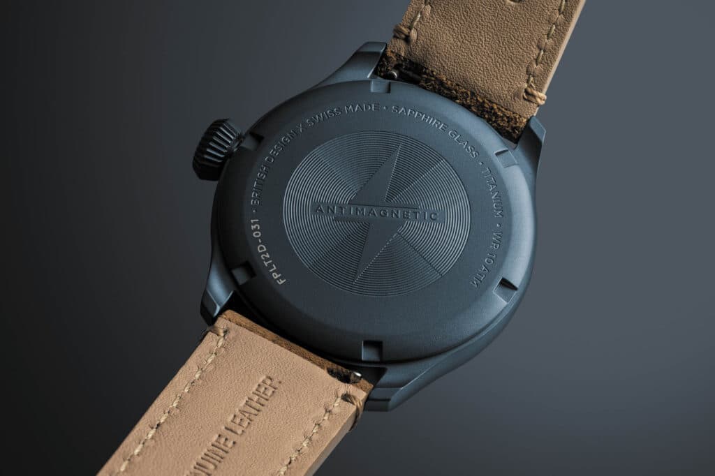 Inside, all four watches run the Sellita SW300-1 automatic with 56 hours of power reserve, protected by a soft-iron Faraday cage rated to 500 Gauss. That’s a meaningful spec for a pilot watch and not just a marketing line, since antimagnetic protection actually fits the category’s purpose. The case is capped with a domed sapphire crystal up front and a solid titanium screw-on caseback. Each reference uses alpha hour and minute hands with Super-LumiNova inlays and an arrow-tipped seconds hand, which gives the family a consistent identity even with the dial variety.