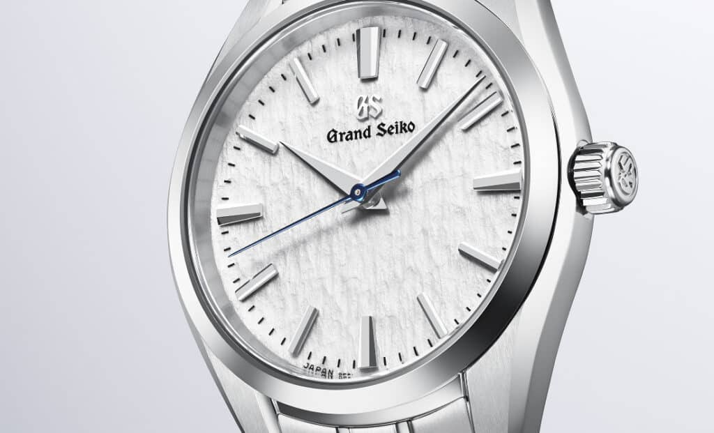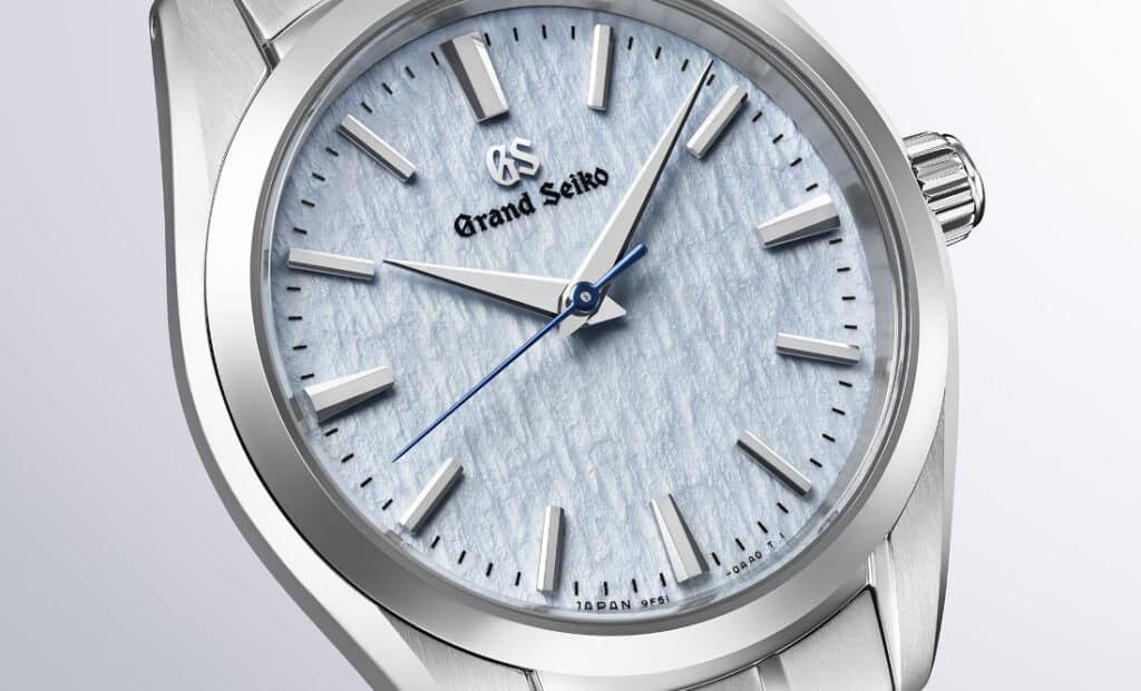The SBGX359 carries the white Snowflake dial, created through a precise stamping process that gives the surface real depth. The SBGX361 “Skyflake” applies the same texture in a pale blue tone inspired by alpine skies. Both feature sharply faceted applied markers, dauphine hands, and a heat-blued seconds hand. The absence of a date window keeps the display clean and symmetrical.