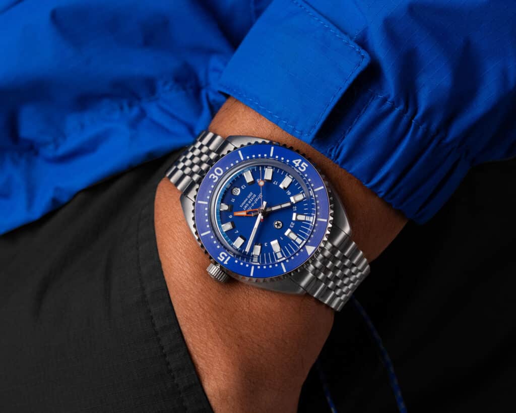 From a design perspective, Jack Mason made some subtle but significant choices. The ceramic bezel no longer features the familiar 24-hour GMT scale. Instead, it’s been swapped for a 60-minute dive timer. That change moves the 24-hour markings onto the dial, tucked in around the applied baton markers. Whether that works visually will likely depend on how you felt about the original.