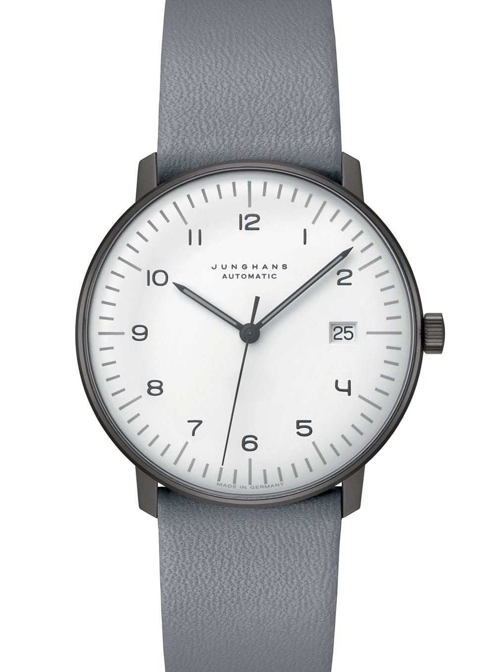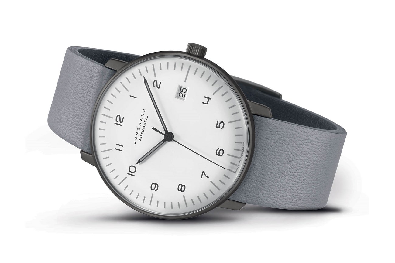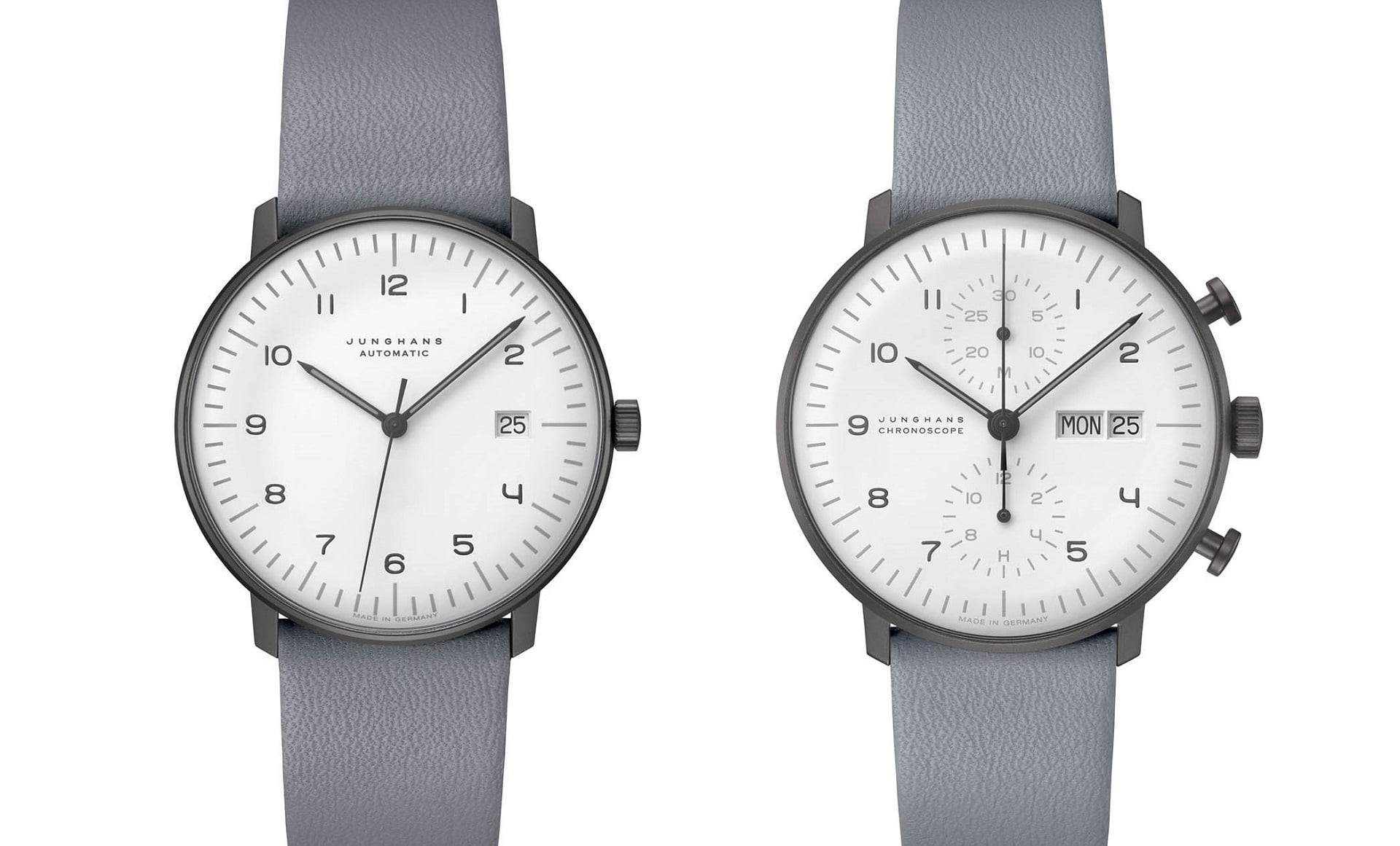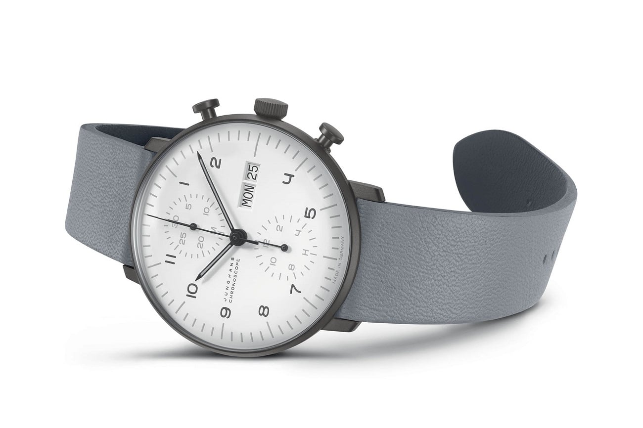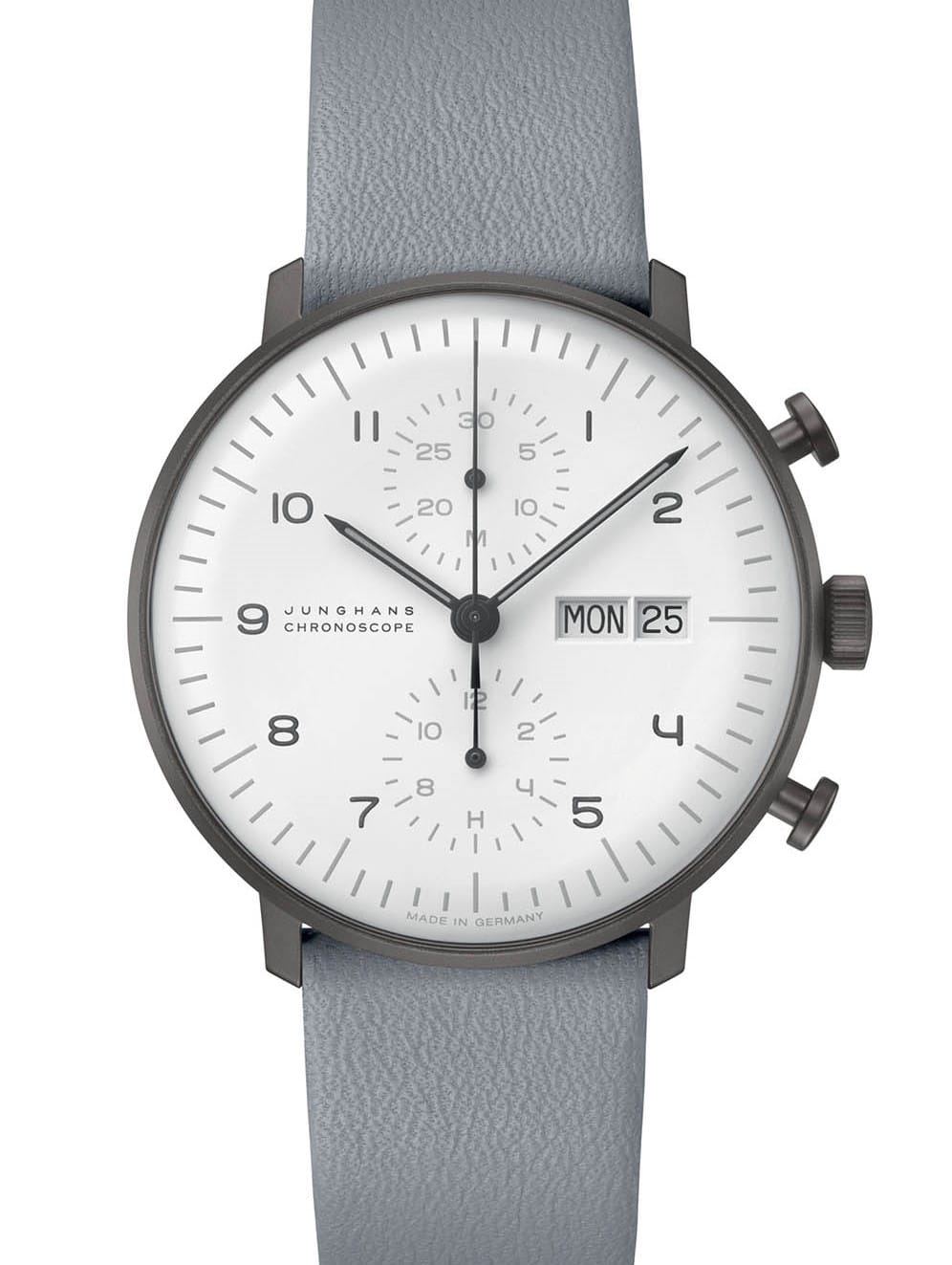 The current iteration of the Max Bill automatic and Max Bill Chronoscope share much of the same DNA as previous versions, though these new releases pay even more tribute to Bill, the Bauhaus school, and architecture as a whole. Taking a cue from Junghans’ previous Max Bill release to celebrate 100 years of the watch, the new offerings all have substituted the traditional stainless steel case for one that is coated with an anthracite-colored PVD. Combined with an anthracite-gray calf leather strap, the case communicates a clear nod to the foundation (no pun intended) of so much Bauhaus architecture, concrete. Continuing on with this theme, the dial itself honors building in all its glory with a matte white dial with black and gray hands, font, and indices. If previous versions of the Max Bill told us, subtly, the story of German modernist architecture, the newest Max Bills are screaming it from the highly-designed, though restrained, rooftops.