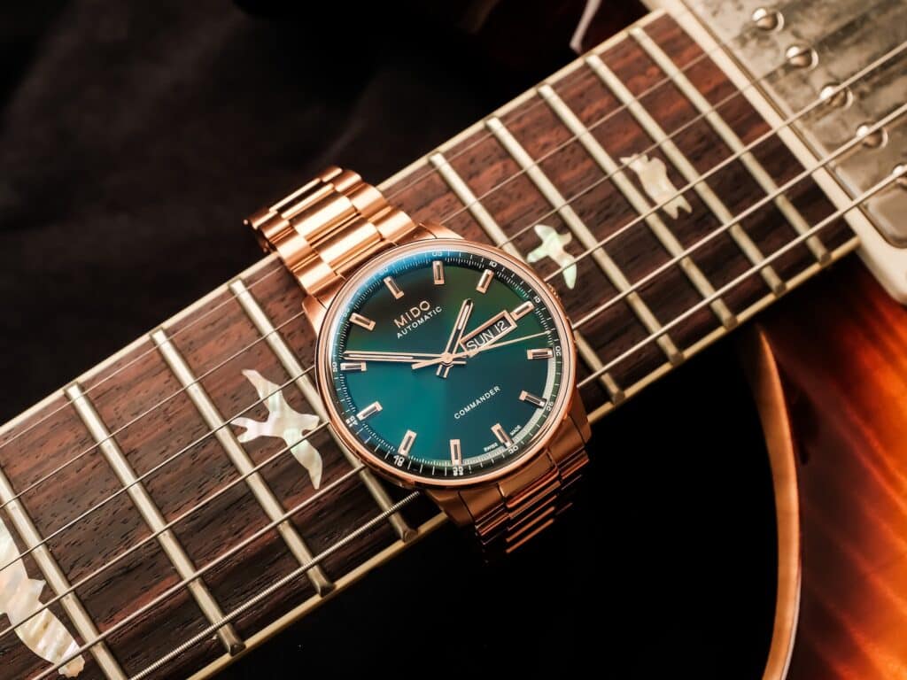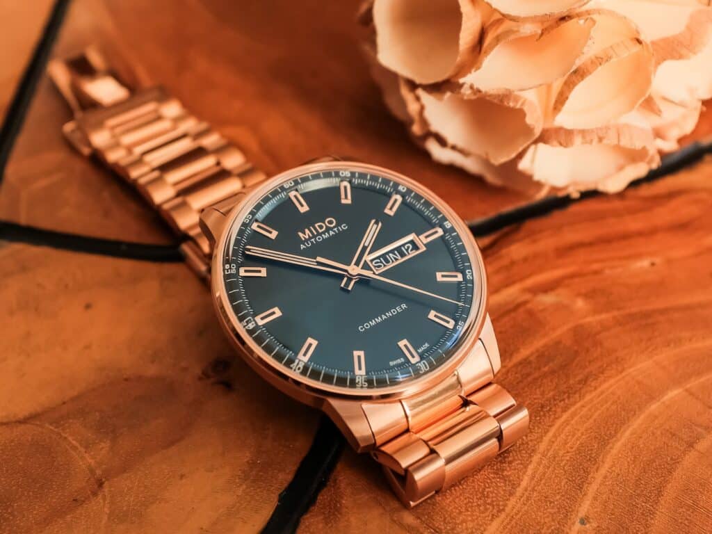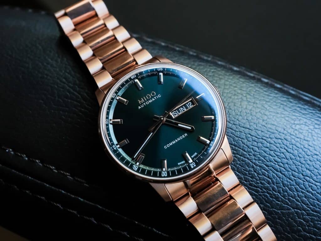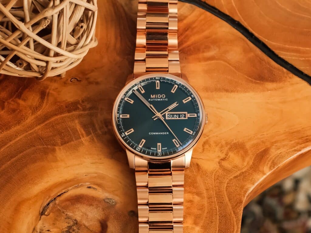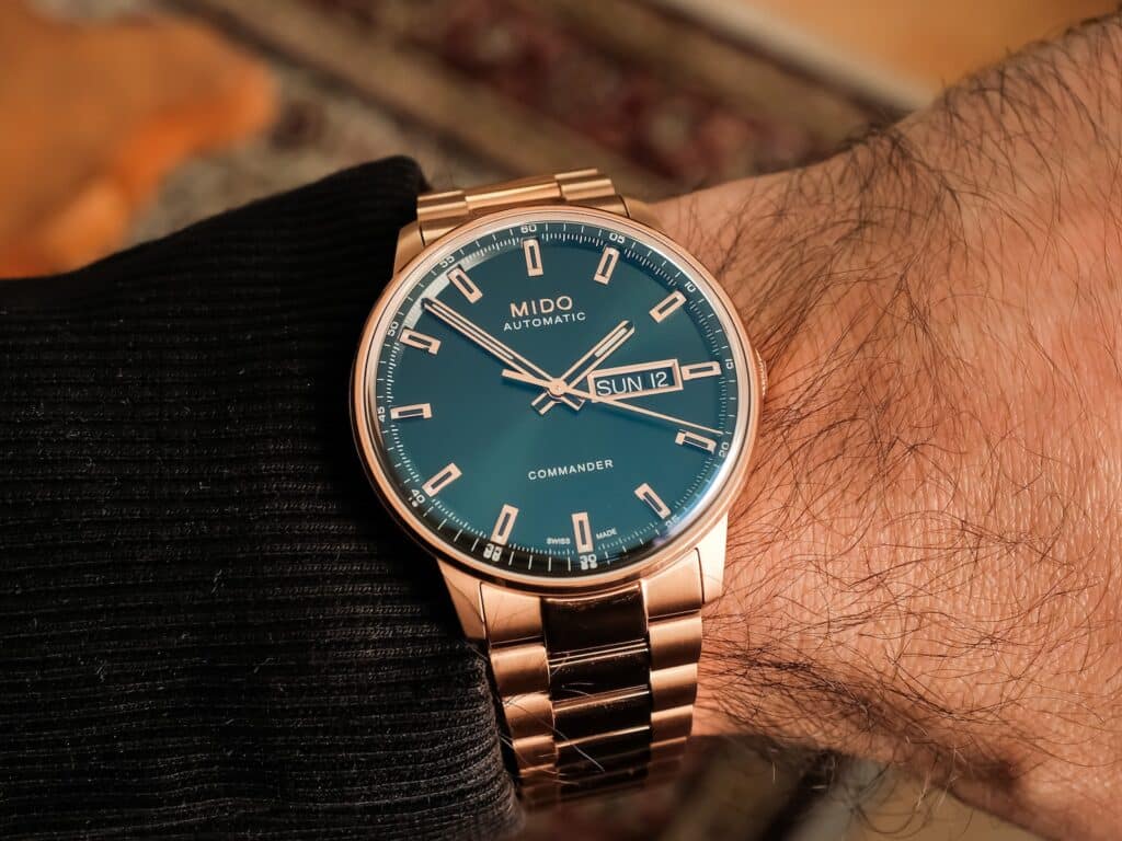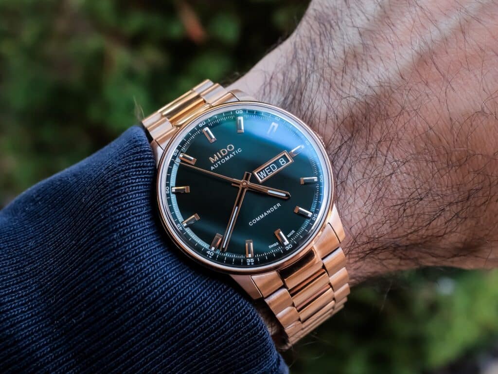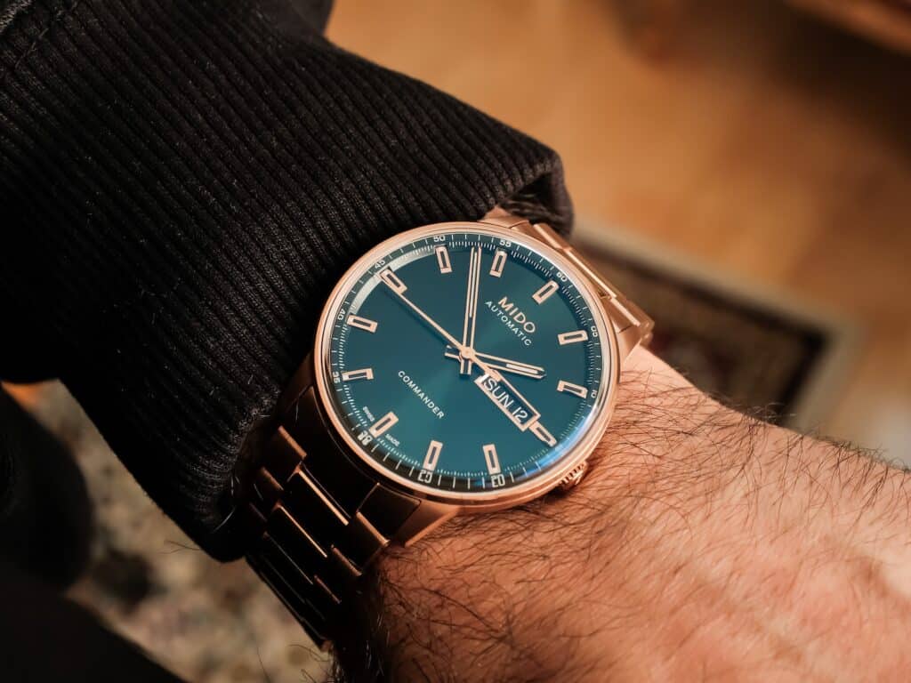 What hit me first was the color, and more specifically how well it all hangs together in person. Rose-gold-tone watches can go sideways pretty fast if the dial doesn’t support the case, or if the whole thing starts leaning too hard into the dressy side of the spectrum. That never really happened here. The warm PVD-coated steel case and bracelet have enough presence to make the watch feel different from the usual steel Mido Commander Datoday, but the green dial keeps it all grounded. In certain light, the dial reads rich and almost a little moody. Then the sunray finish catches a different angle and the whole watch opens up. It has a retro vibe for sure, but it doesn’t feel like Mido is trying to force some heavy-handed throwback story onto it.