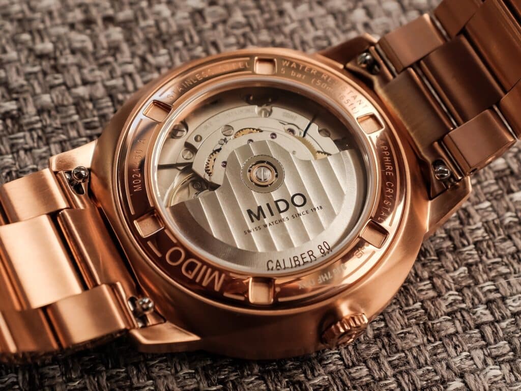 Turning the watch over, you get a view of Mido’s Caliber 80 through the display caseback. This is one of those movements that probably won’t dominate the conversation around the watch, but in day-to-day use, it makes a lot of sense. It’s an automatic movement with an 80-hour power reserve and that’s the part I appreciate most. There’s something nice about being able to take a watch off for a couple of days, come back to it, and not have to reset everything from scratch.