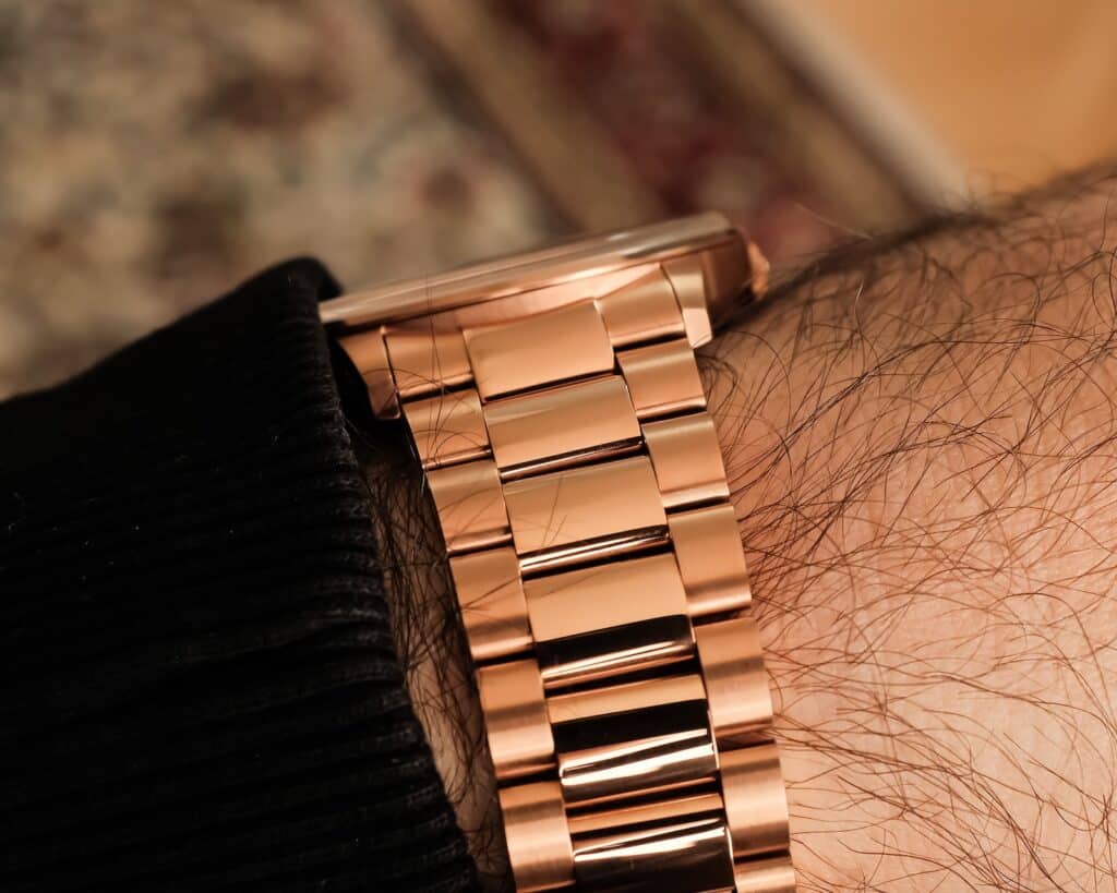 The bracelet keeps the approach going. It’s a three-link design with a mix of brushed and polished surfaces, all done in the matching rose-gold-tone PVD, so nothing feels disconnected from the rest of the watch. At 21mm at the lugs, it has a bit more presence than you might expect, and the quick-release spring bars are an easy win. On a watch like this, where I can absolutely see someone wanting to change the look from time to time, that kind of convenience is nice.