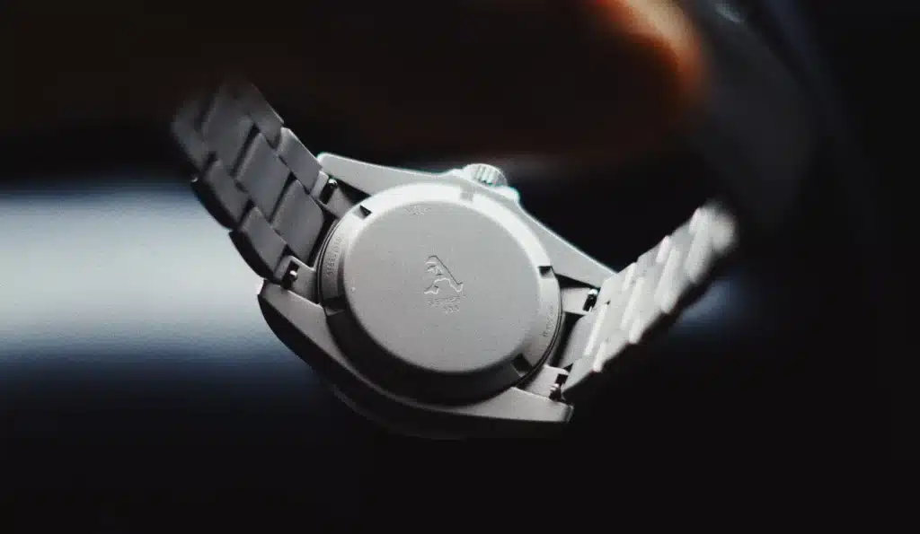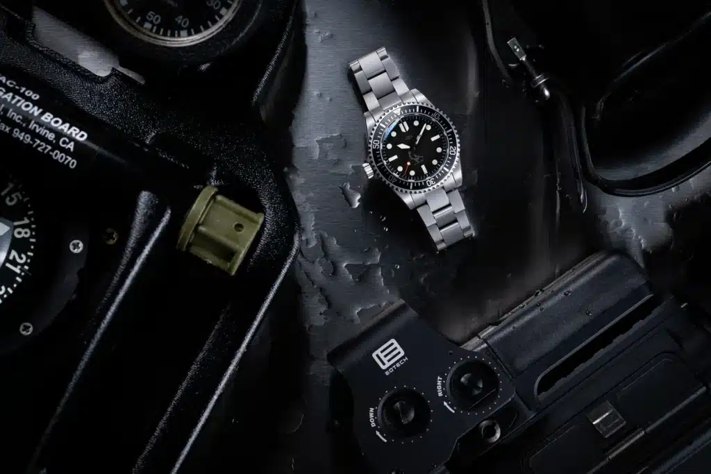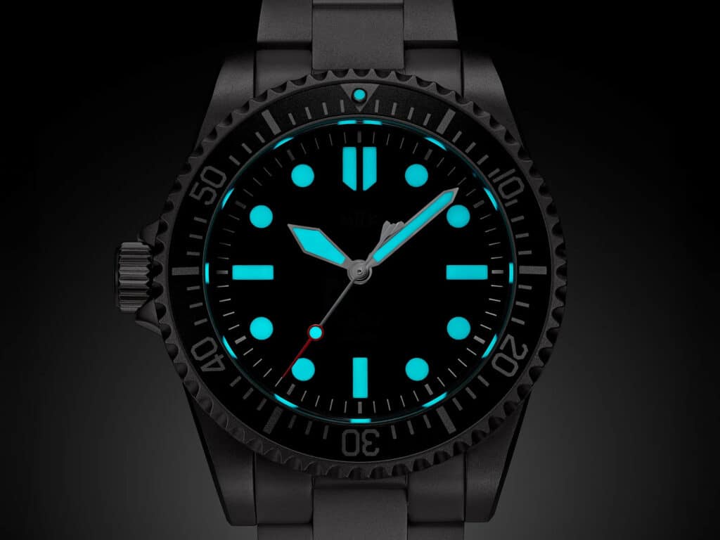 The handset leans into familiar military territory. Sword hands have been part of British dive watch history since the 1960s, and they remain one of the most legible shapes you can put on a tool watch. The sweep seconds hand adds a red tip and a luminous marker tucked inside the hour track, with a counterweight designed to symbolize speed and endurance. Symbolism aside, the emphasis here is clearly legibility first.