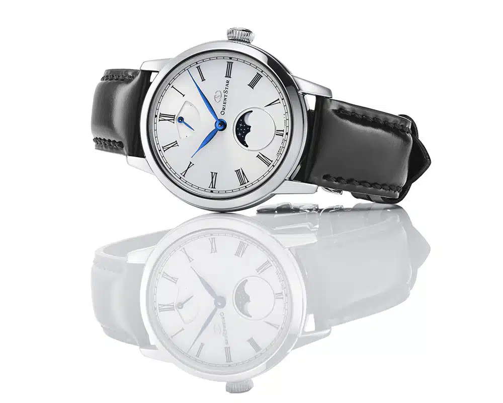 The dial layout is classically structured. Elongated Roman numerals sit alongside a rail-track minute scale, with blue leaf-shaped hands providing contrast. The moonphase is positioned at six o’clock and presented on its own, without a pointer date or running seconds integrated into the aperture, keeping the lower half of the dial open. At twelve o’clock, the power reserve indicator remains a signature Orient Star element and balances the composition.