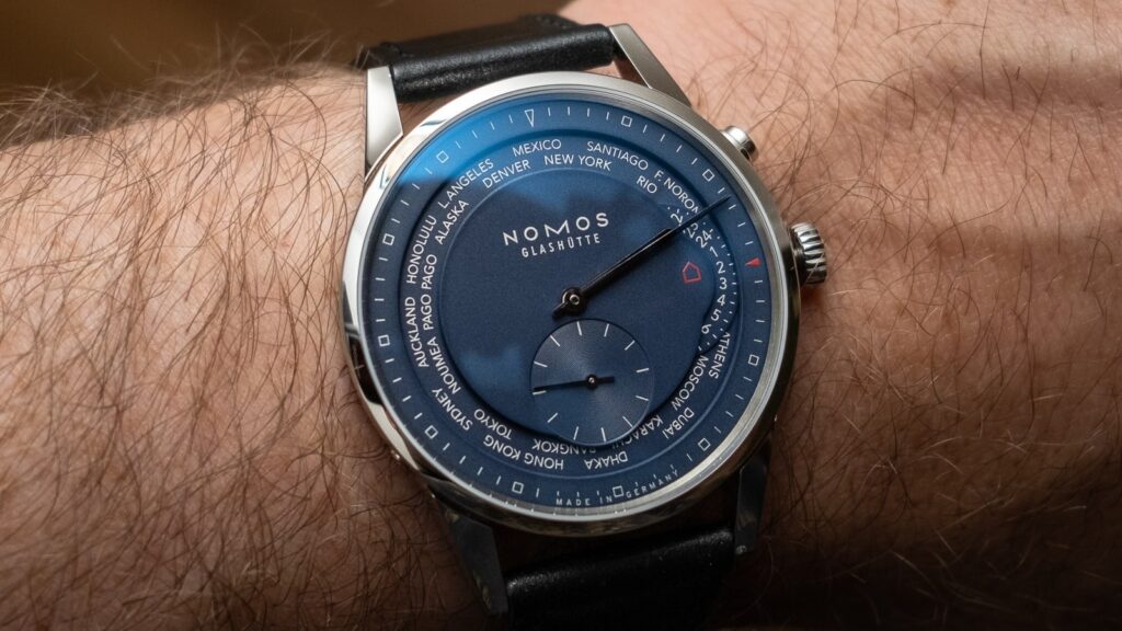 The Nomos Zürich World Time is a good example of a watch whose character sneaks up on you. It does not announce itself with color, bulk, or an exaggeratedly complicated layout. In fact, that restraint is the whole appeal. The matte blue dial stays calm on the wrist, shifting gently between navy and a cooler steel tone depending on the light. That low-key behavior gives the watch more personality over time than a louder design probably would. The city ring stays clear, the rhodium hands are easy to track, and the small red home-time marker adds enough contrast to keep things readable in everything from office lighting to bright airport terminals.