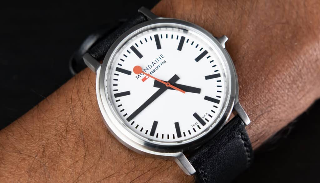 The Mondaine Stop2Go is the kind of watch that makes sense in a list like this because its appeal has almost nothing to do with chasing bigger numbers or more impressive specs. On paper, it looks almost too plain: white dial, black markers, red second hand, straightforward case. Then you watch the second hand reach 58, freeze in place, the minute hand jumps forward, and the whole thing starts again. That tiny interruption changes the entire experience. It turns a clean quartz watch into something you interact with and wait for. After a while, that pause becomes the reason you keep looking down at it. It gives the watch a quiet personality that most minimal designs never manage.