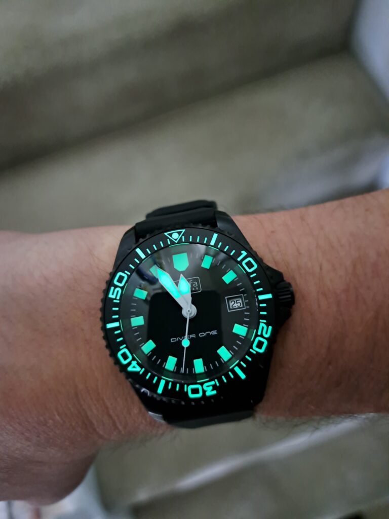 For the money, you get a very satisfyingly well made product: 500m water resistance, HEV, ETA quartz movement, extremely domed crystal sapphire, and amongst the brightest lume I’ve ever seen – outside of Seiko!