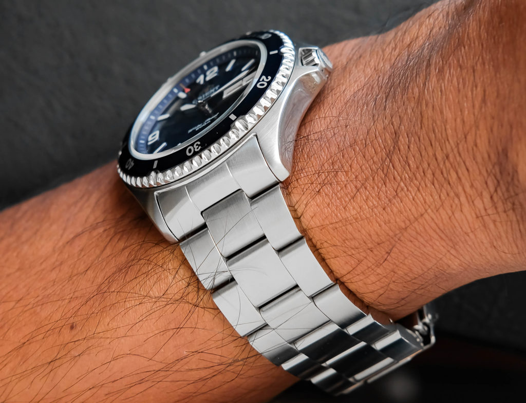 The Orient Mako II takes a more traditional and deliberate approach. As also mentioned in our in-depth review, the deep blue sunburst dial has a softer, more fluid sheen that reveals itself slowly, with applied markers outlined in polished metal that catch light without overpowering the dial. The raised chapter ring adds depth and structure, while the sword-style hour and minute hands feel purposeful, with the red-tipped second hand providing a subtle but welcome point of contrast. On the wrist, the Mako II feels solid and composed, leaning into its dive-watch identity rather than versatility. The bracelet, while using hollow-end links, wears better than expected; it feels cohesive once on the wrist, and the double-locking, push-button clasp is quite well-executed for the price, complete with micro-adjustments and thoughtful finishing. A noteworthy feature of the clasp is the choice to sandblast the inner folding joint, which demonstrates attention to detail.