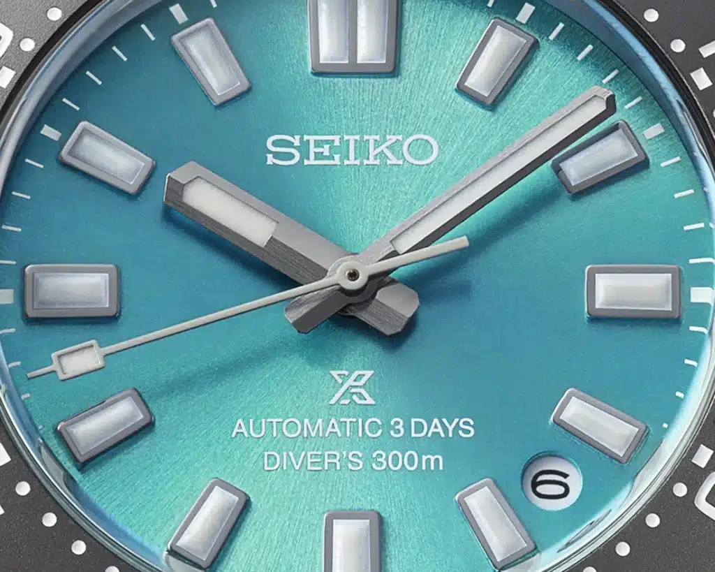 Everything else stays within the established framework. A 40mm super-hard-coated stainless steel case. A screw-down crown at 3:00. 300 meters of water resistance. The 6R55 movement with its three-day power reserve. Sapphire crystal with anti-reflective coating on the underside.