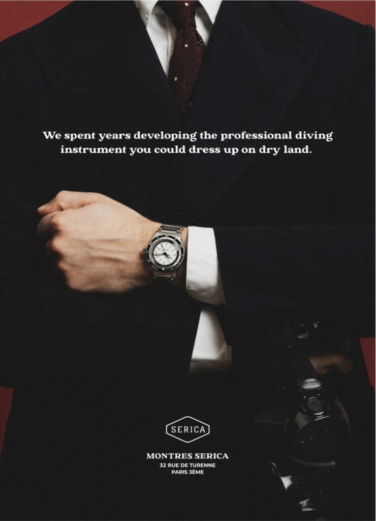 For its sportier pieces, Serica has gone to great lengths to increase its association with the French military. It started with the original 5303 and the “S617” text on the dial. S617 is the designation for a recently-retired French ballistic missile submarine, Le Téméraire (or Daring). In 2024 it began a partnership with the Ecole de Guerre, the French War College, to offer a special version its field watch for sale to graduating officers. They also recently released a limited edition 5303 with a bezel specifically patterned after timing tables for French Naval Explosive Ordnance Disposal (EOD) technicians. While some of their ad campaigns on Instagram are a little over the top, I do appreciate some of their tribute to older watch marketing. Serica has a page dedicated to pdfs of posters that are reminiscent of old watch ads.