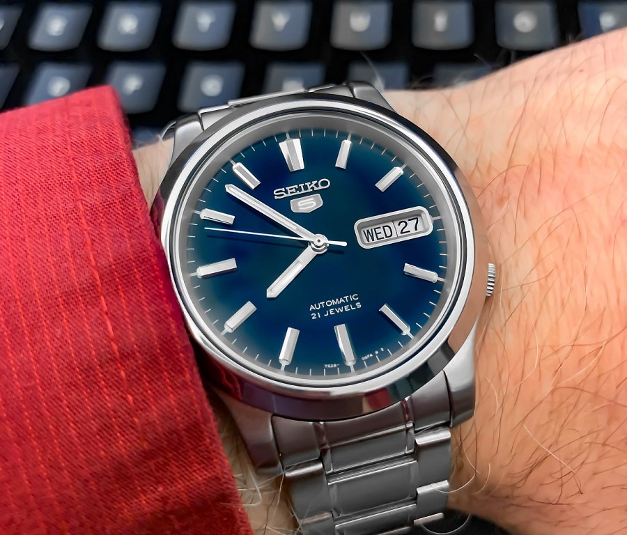 Some watches grab attention with their size or flash; the Seiko 5 SNK793 achieves this by simply getting aspects right in a smaller package. At 37mm, it wears effortlessly, especially on wrists that feel swallowed by modern case sizes. As mentioned in our dedicated review, the proportions strike a delicate balance: thin enough to stay out of the way during daily wear, yet sturdy enough to feel purposeful on the wrist. The brushed case flanks contrast nicely with the polished bezel, adding a touch of sparkle without feeling too dressy or fragile. The recessed 4 o’clock crown keeps the profile smooth, though it takes a little patience to operate.