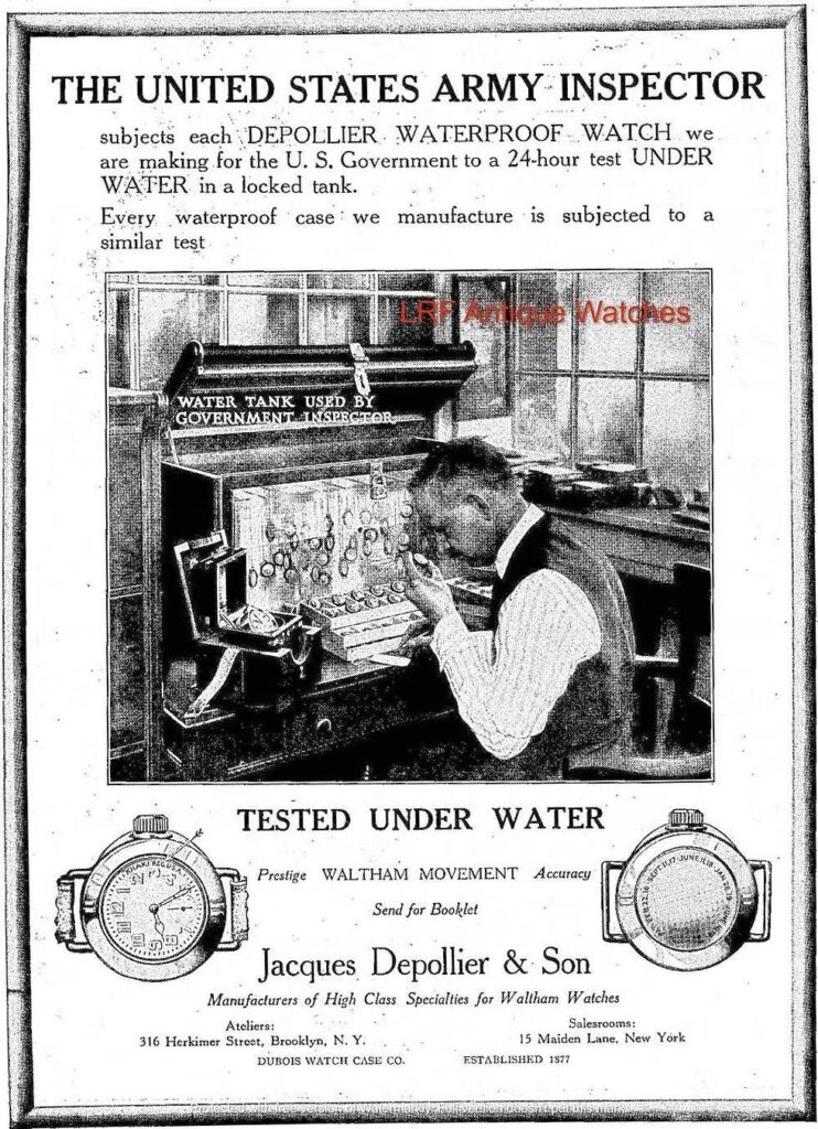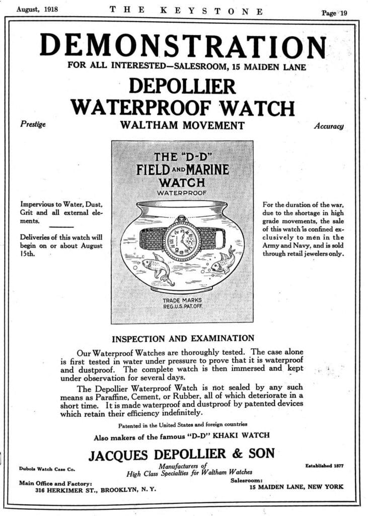 Watchmaking is full of gratuitous claims and overinflated marketing. One of the oldest is Rolex’s claim, still on their website today, that the Oyster Perpetual was the world’s first waterproof watch in 1926. These claims were the basis for Rolex’s reputation for reliability and ruggedness. While Rolex’s Oyster Perpetual was highly water resistant, it was not the first company to create a successful water-resistant design. That title belongs to Charles Depollier, who was fulfilling orders for the U.S. Army as early as 1919.