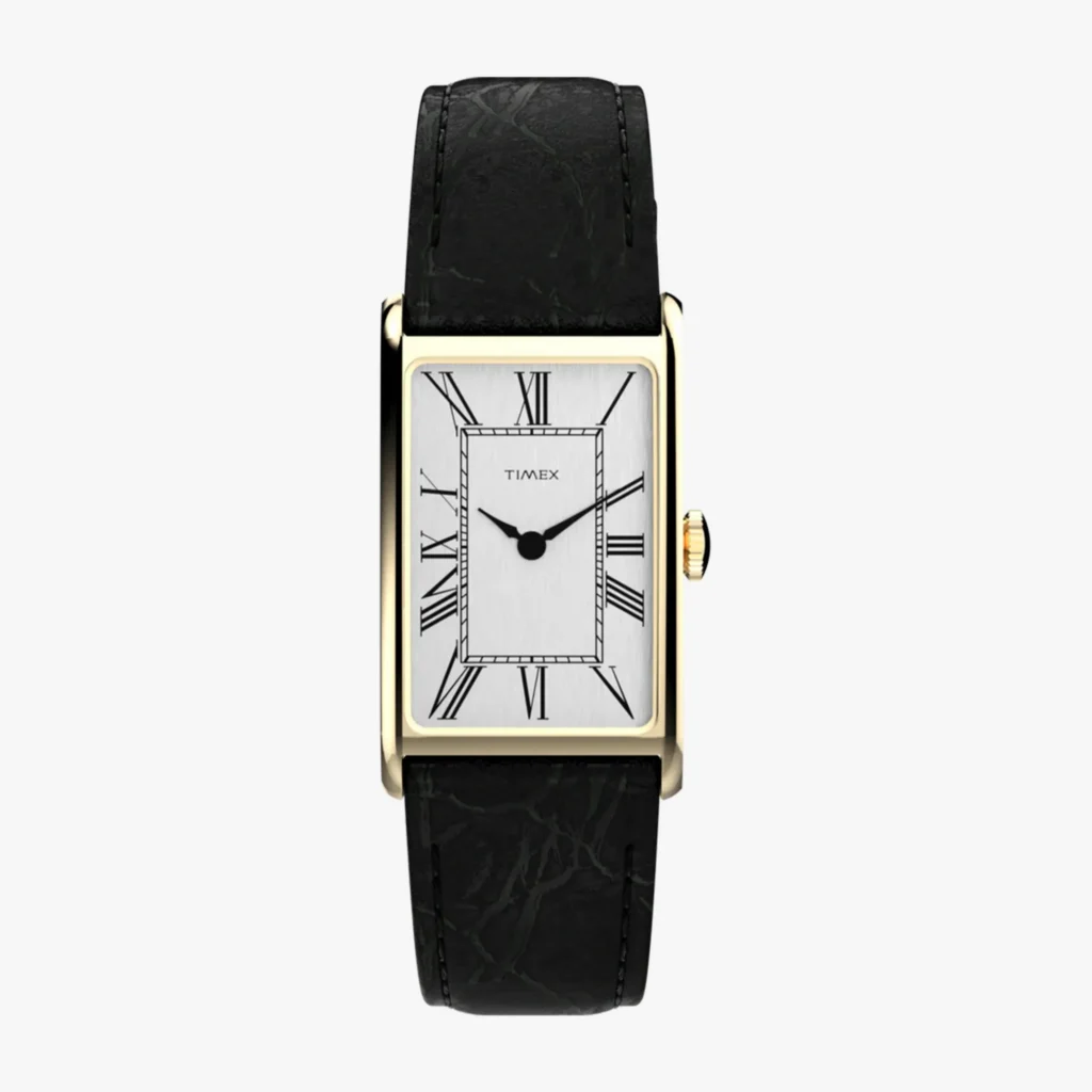 The design here draws heavily from the Cartier Tank, and there’s really no dancing around that. Timex doesn’t name a specific archival reference for the Lexington, but the silhouette closely mirrors what collectors have identified as the Cavatina, a hand-wound Timex from the same era that originally retailed for around $15 or $16. That’s a fun piece of context when you consider what Cartier charges for the real thing today. The only quartz Tank on leather currently available from Cartier comes in yellow gold at $13,100. So yes, there’s a gap in the market, and Timex is clearly aware of it.