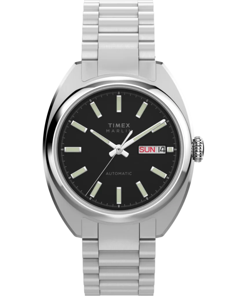 The Timex Marlin Draper Automatic takes the familiar Marlin formula and reshapes it through a distinctly mid-century lens. The 37mm stainless steel case is modest by design, finished with vertical brushing across the top and framed by a polished bezel that surrounds a round dial opening. It feels intentionally restrained in photos and renders, leaning more toward period correctness than modern reinterpretation.