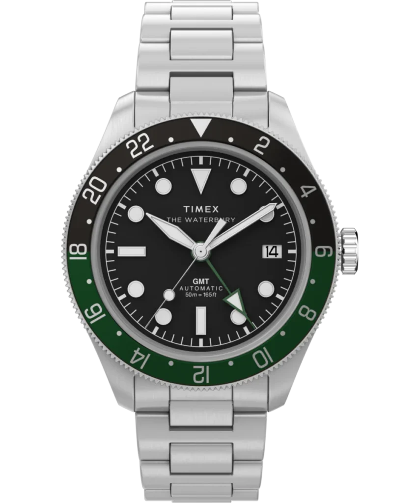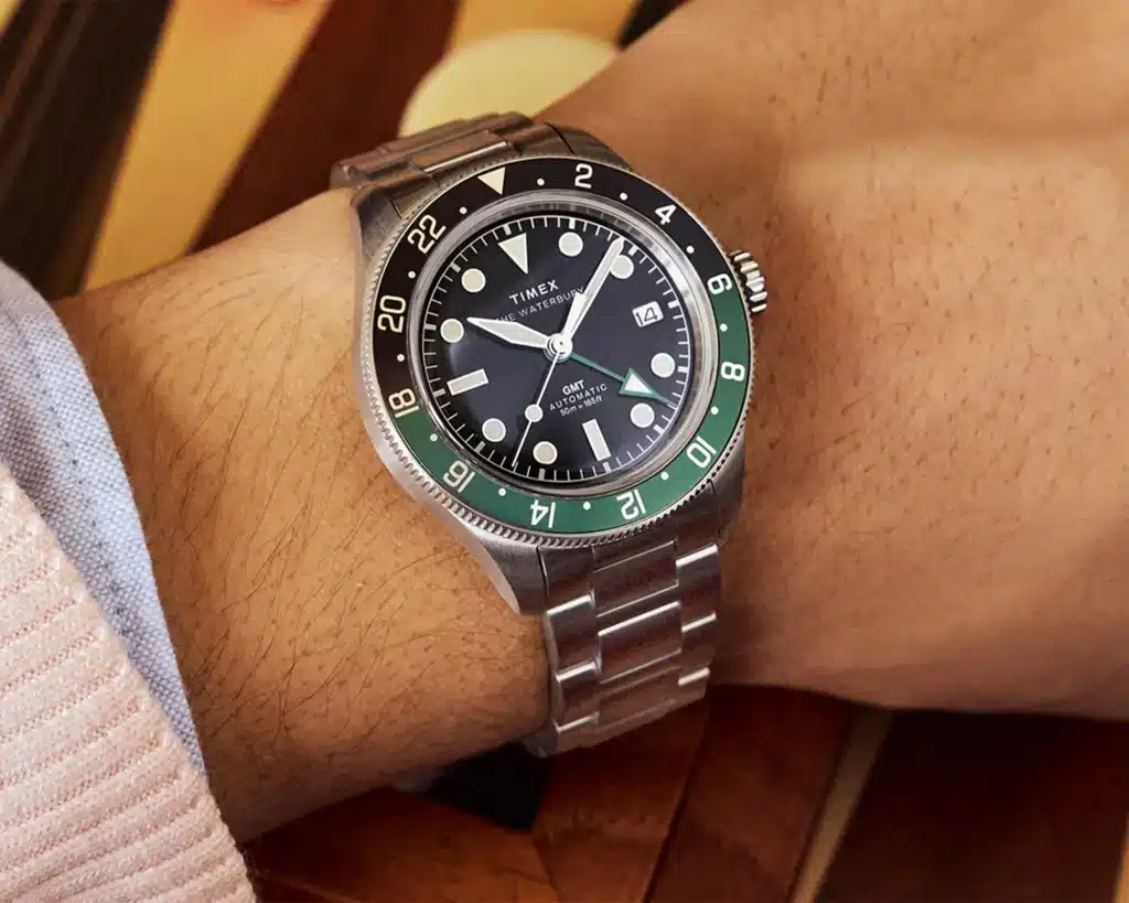 The Timex Waterbury Heritage Automatic GMT launches in two colorways that will be immediately familiar to anyone who’s spent time browsing GMT bezels. There’s a black and red version clearly nodding to the “Coke” GMT Master, and a black and green option pulling from the “Sprite.” Each variant gets a color-matched GMT hand, red or green respectively, and the overall dial layout leans heavily into that classic GMT Master template.