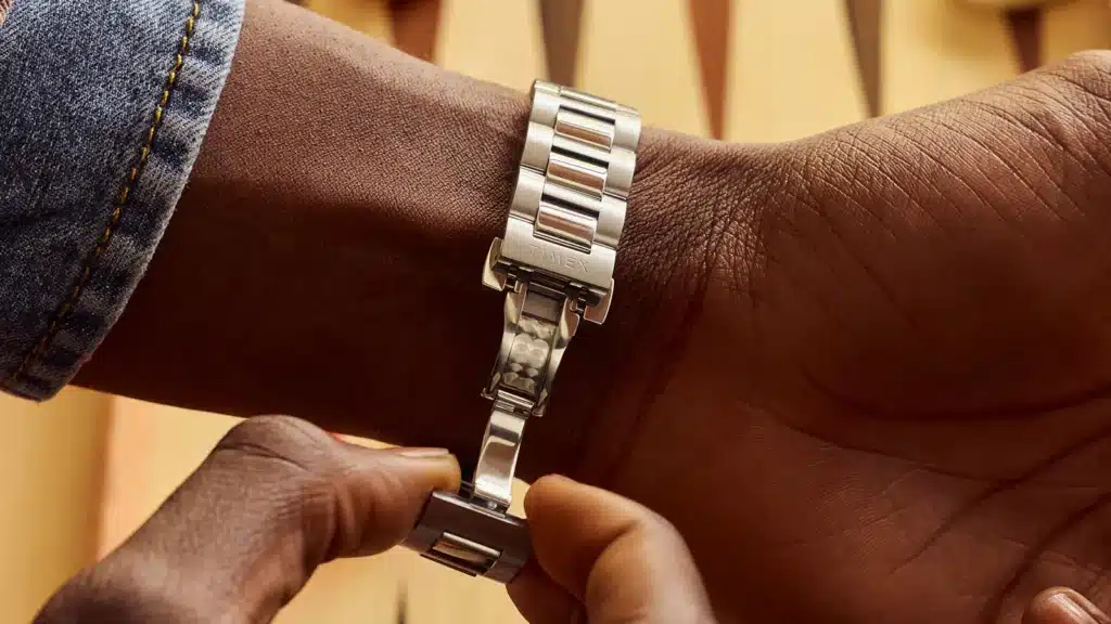 Timex is offering the Ice Blue edition in two configurations. On the stainless steel H-link bracelet with a butterfly clasp and quick-release system, it comes in at $349. The quick-release feature is a nice touch for anyone who likes to rotate straps without hunting for a spring bar tool. The second option is a brown perforated leather racing strap with a traditional pin buckle, priced at $299, which leans harder into the vintage motorsport vibe.