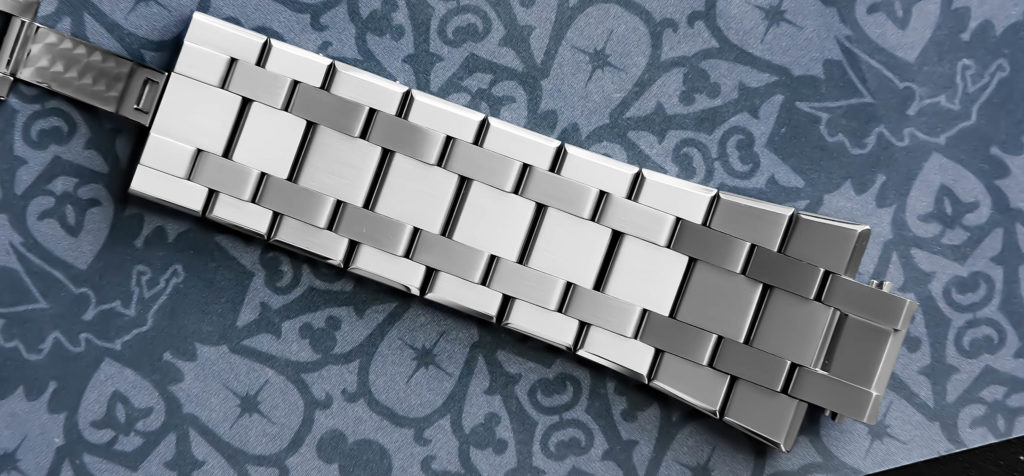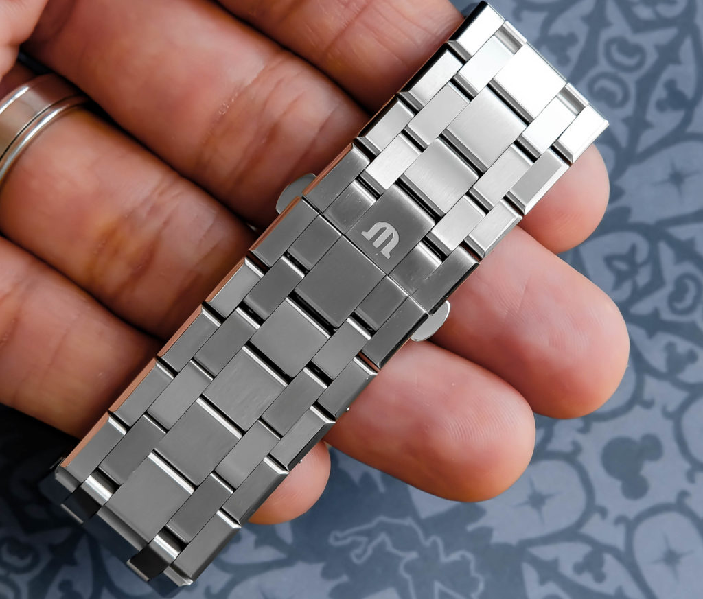 The Maurice Lacroix Aikon Automatic takes bracelet execution several steps further, and during our time spent with it, it was clear that this is the centerpiece of the watch. Each link features multiple brushed surfaces contrasted by sharply beveled, high-polished edges, which creates constant shifts in reflection as the wrist moves. The taper from the lugs down to the clasp feels gradual and deliberate. The hidden butterfly clasp disappears completely into the bracelet, creating an uninterrupted visual flow, and even the interior of the clasp reveals detailed perlage finishing—something only the wearer will notice, but adds to the sense of care in construction. The clasp action itself is smooth and secure, though the highly polished internal surfaces can show scuffs over time with regular use. The bracelet conforms comfortably, but its presence never fades into the background.