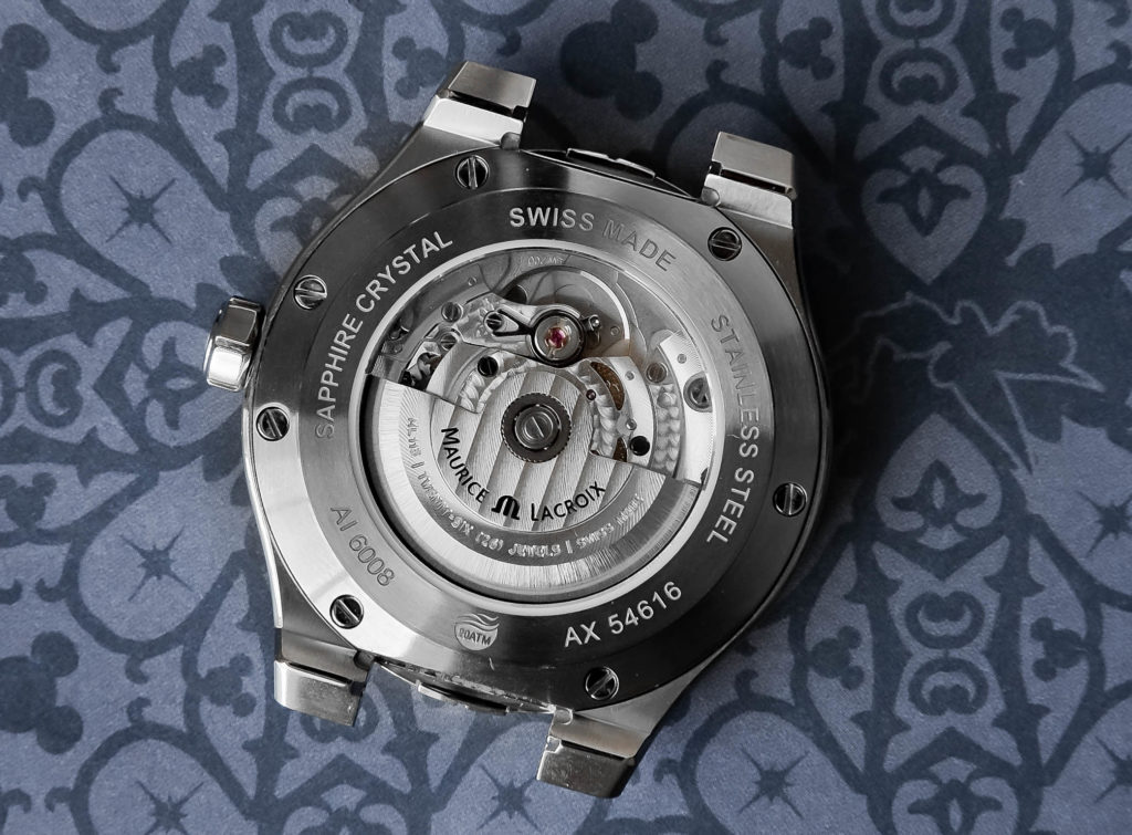 The Maurice Lacroix Aikon Automatic takes a more traditional mechanical route with its ML115 caliber, which is based on the Sellita SW200 architecture. During our extensive testing, the movement delivered dependable performance, but it didn’t feel like the focal point of the watch. It features standard decorative elements like perlage and Geneva striping, and the branded rotor reinforces its identity within the case. In daily use, it performed as expected for a mechanical three-hander with a date and a power reserve of around 38 hours. However, the manual winding action carried a bit too much resistance: a quirk we’ve experienced with other Sellita-based watches as well. It’s a capable and serviceable movement, but it doesn’t carry the same sense of refinement or intentionality as the bracelet and exterior finishing.