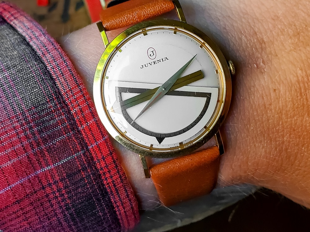 Most of that comes from the dial. The eggshell-white tone that developed over time gives it a softer, lived-in look, and the applied gold markers keep the outer track readable without competing for attention. The “J” emblem sits at the twelve with “Juvenia” below. Then your eyes land on the hands, or what passes for hands here. The white protractor-style hour display, the gold-plated, ruler-like minute hand, and long silver seconds hand turn the whole watch into a miniature measuring instrument. It is clever without feeling cute. More importantly, it still works once you give it a little time. Legibility is not instant. While reviewing this piece, we had to adjust to it, and anyone expecting a quick, conventional read will probably feel thrown off at first. By the end of the day, though, the layout started to click. That learning curve became part of the charm rather than a deal-breaker.